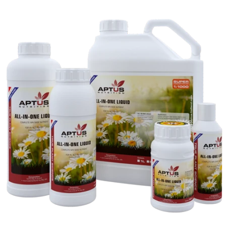 Aptus ALL-IN-ONE LIQUID is een volledig minerale meststof, opgebouwd uit de essentiële elementen stikstof, fosfor, kalium, magnesium en de micro-elementen boor, molybdeen, ijzer, mangaan, zink en koper.